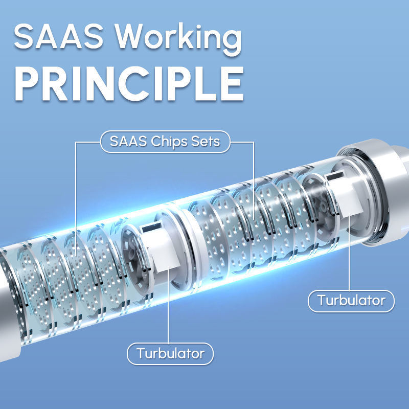 Преобразование кристаллической структуры для удаления накипи: SAAS преобразует существующую твердую накипь (кальцит) в более мягкую, чешуйчатую форму (арагонит), которая постепенно отделяется и вымывается, обеспечивая безопасное и эффективное удаление накипи без химикатов.